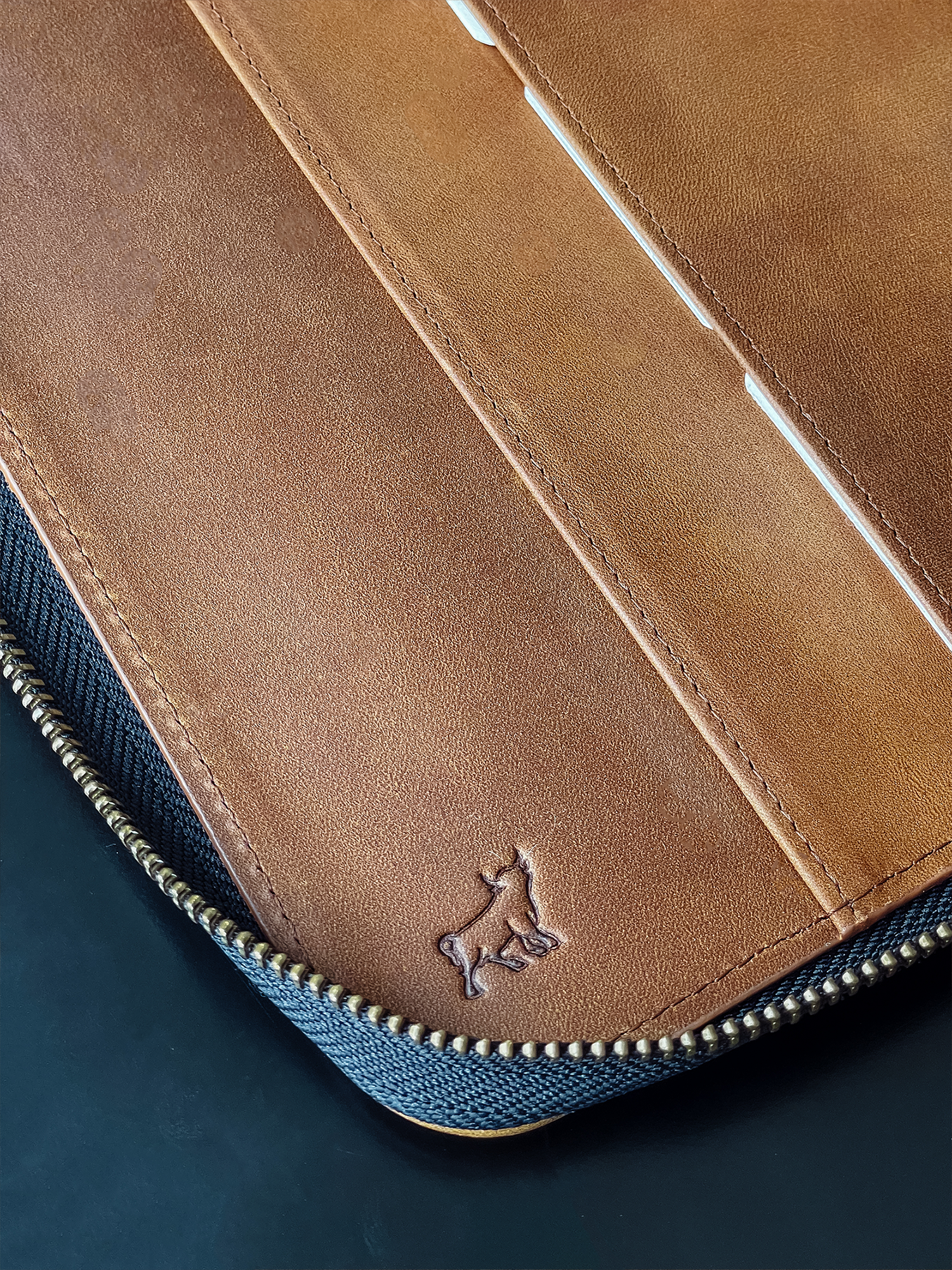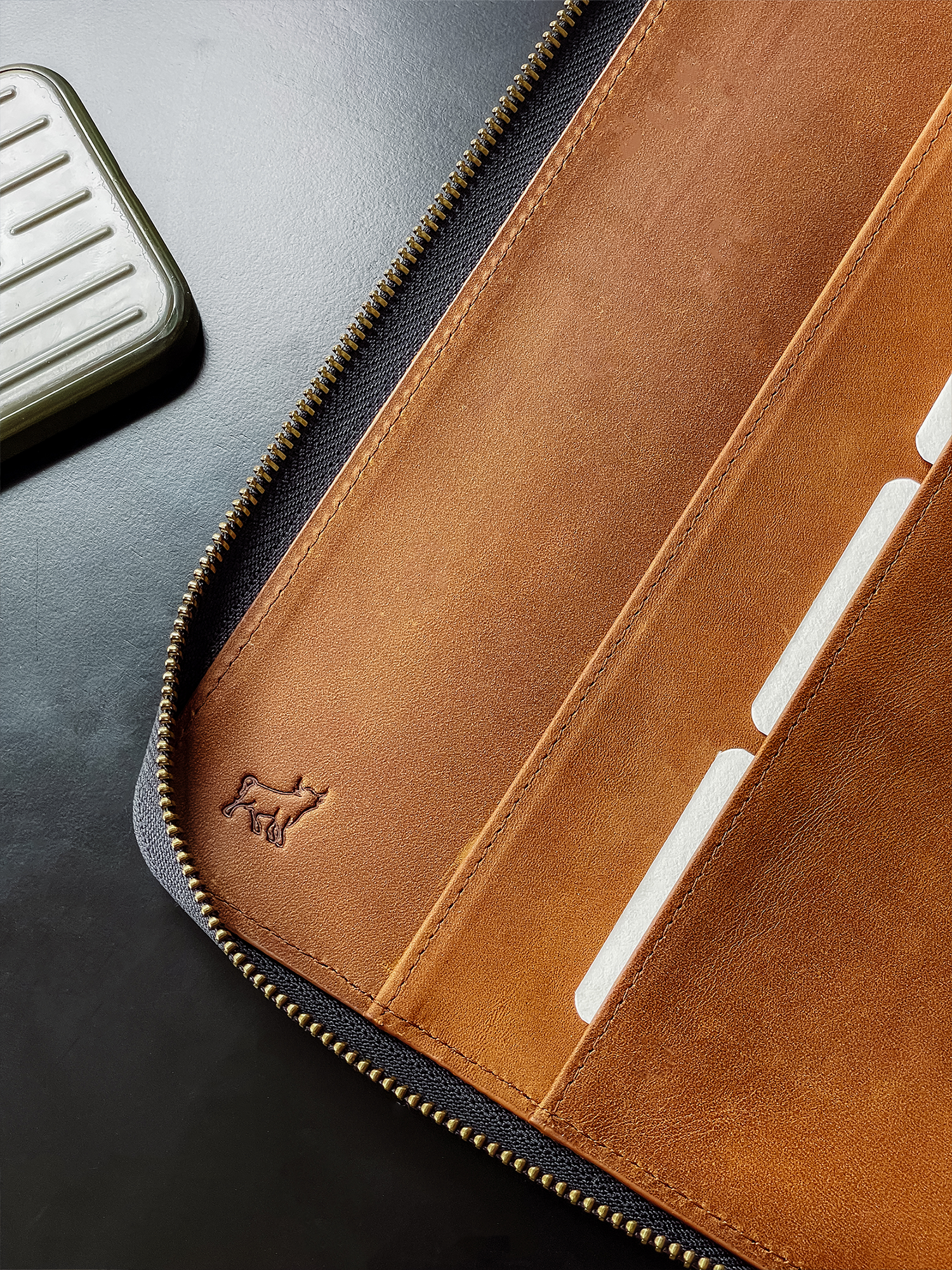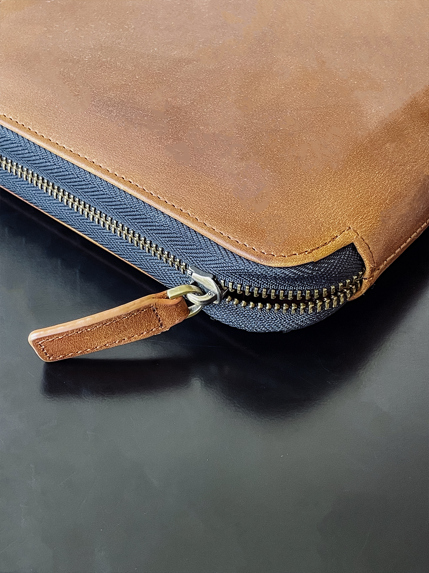 Zipper pulls and leather edges are the first to show signs of wear. To protect these high-wear areas, we hand-apply three layers of edge paint for resilience.
