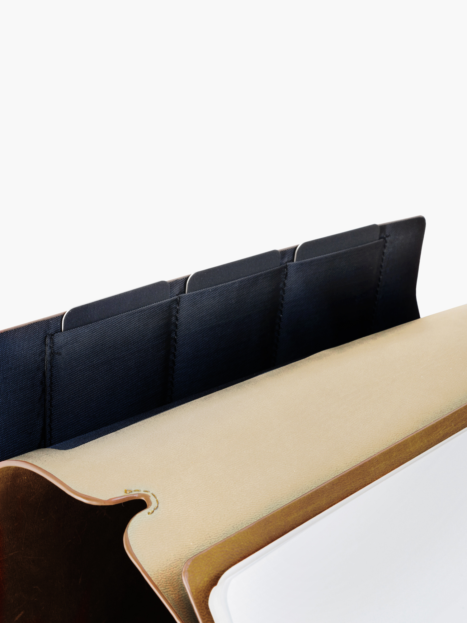Magnetically snaps closed for secure travel without elastic straps. 3 hidden card pockets, 2 large page pockets, 2 cord pockets and a notch to hold your pen.