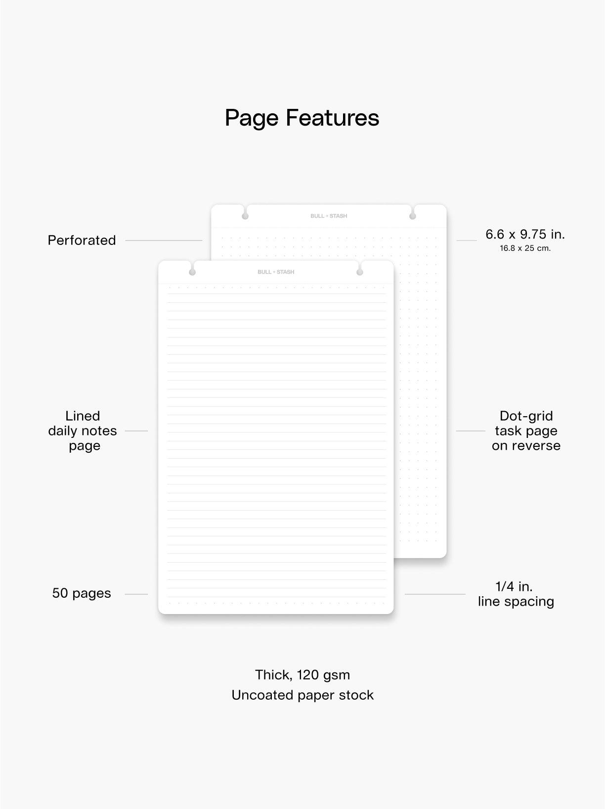 Lined paper on the front, dot-grid on the reverse. Card stock spine included.