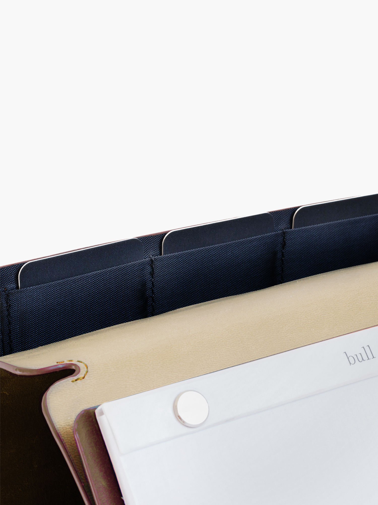 Magnetically snaps closed for secure travel without elastic straps. 3 hidden card pockets, 2 large page pockets, and a notch to hold your pen.