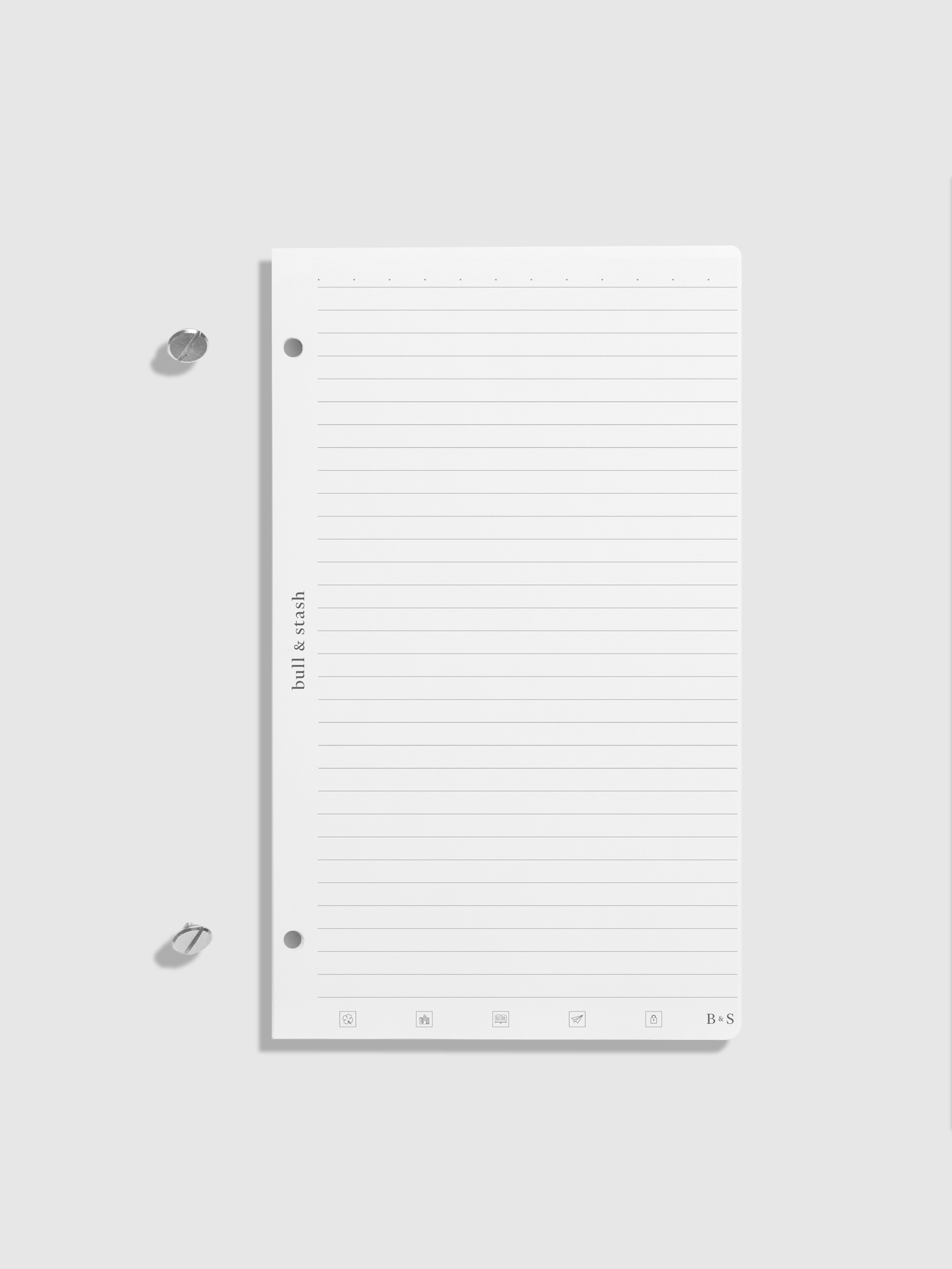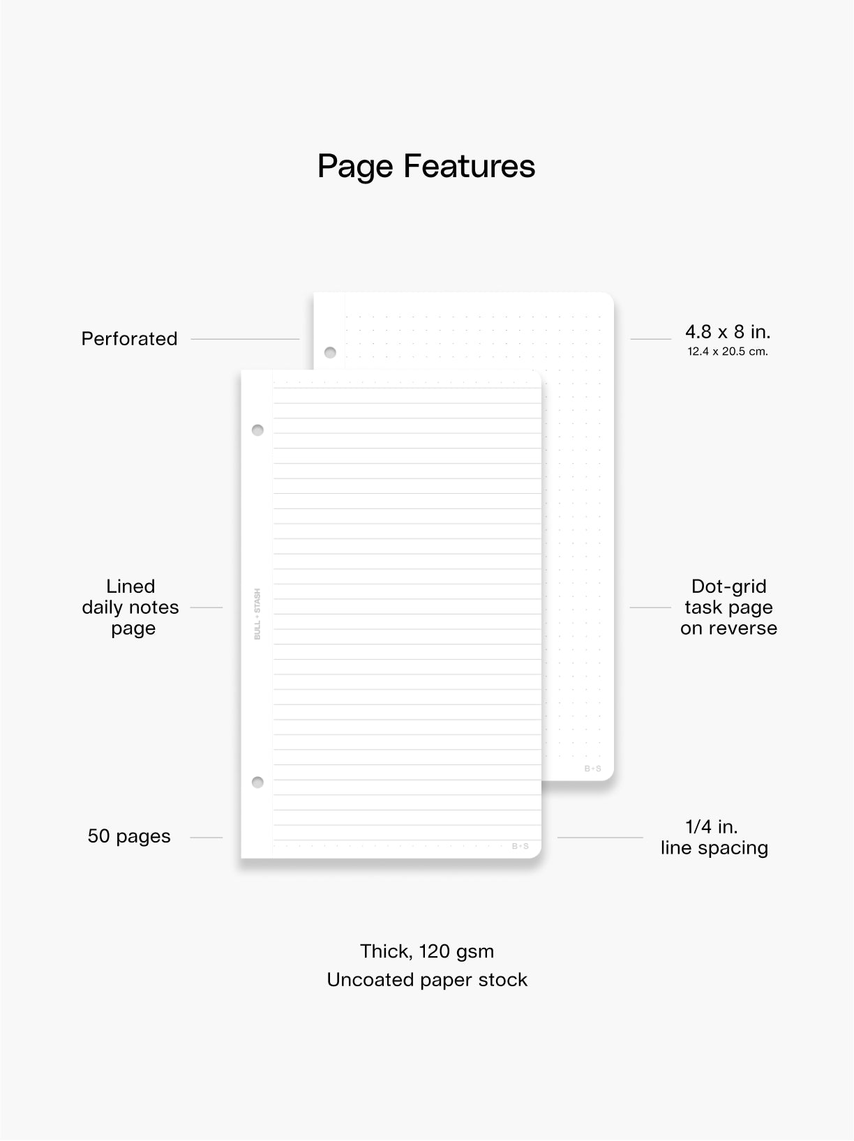 Lined paper on the front, dot-grid on the reverse. Card stock spine included.