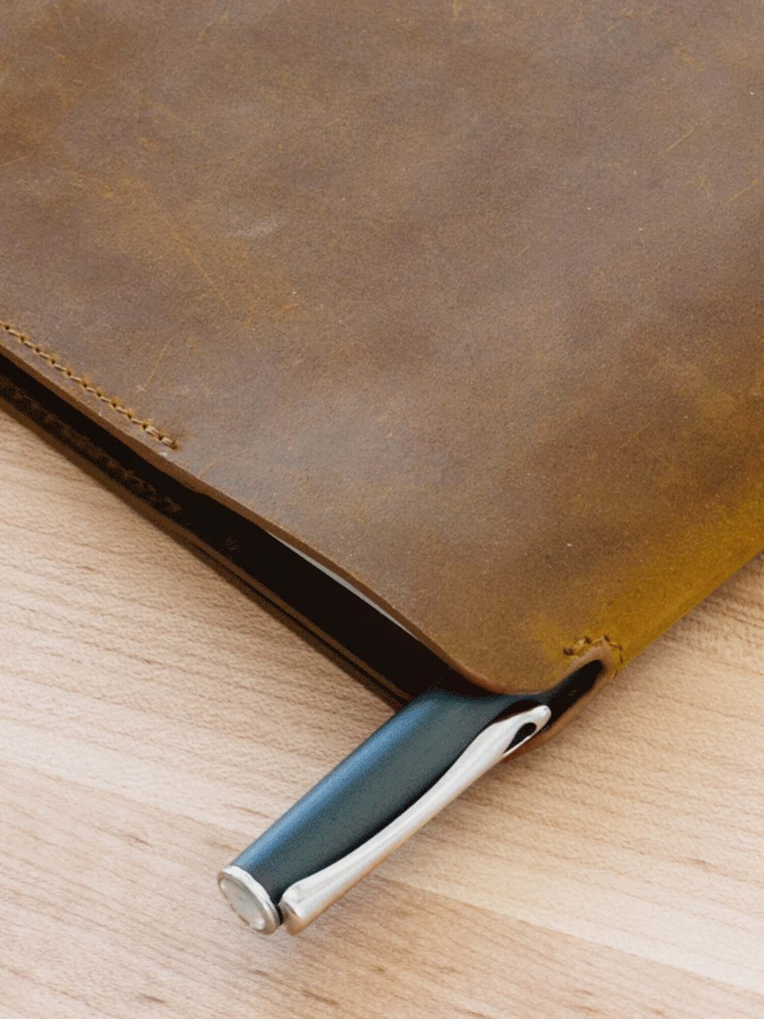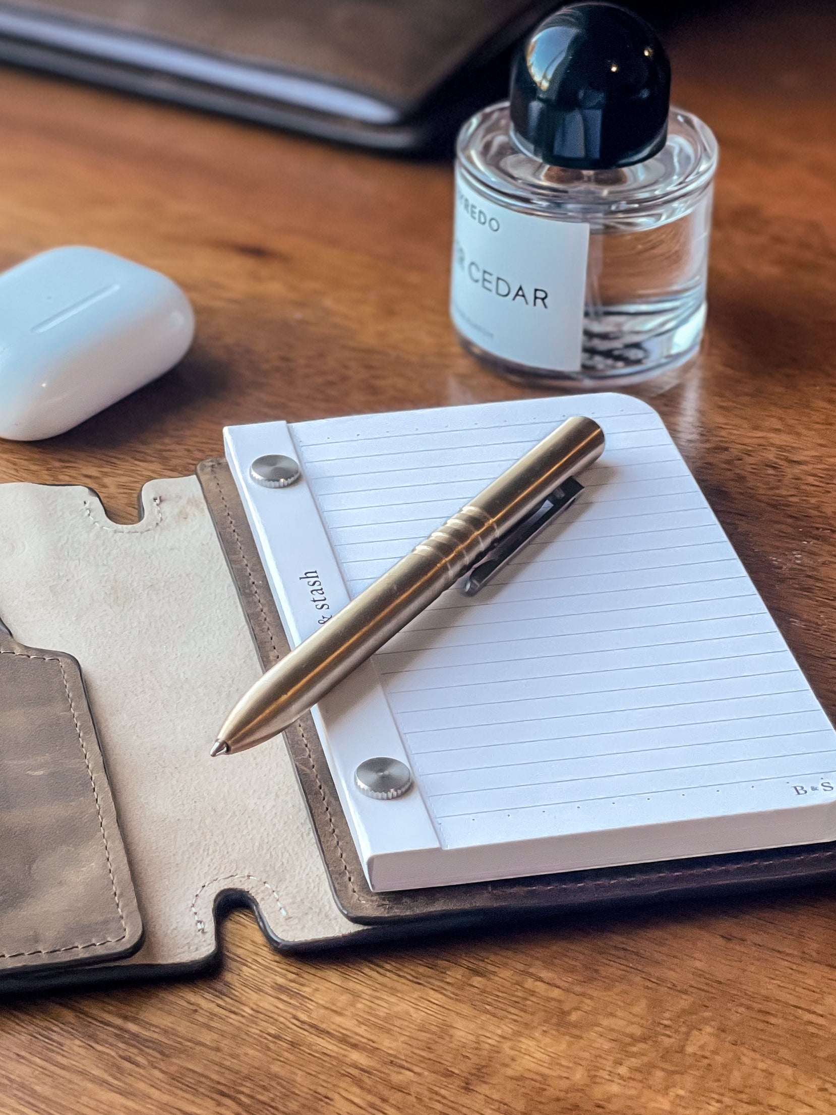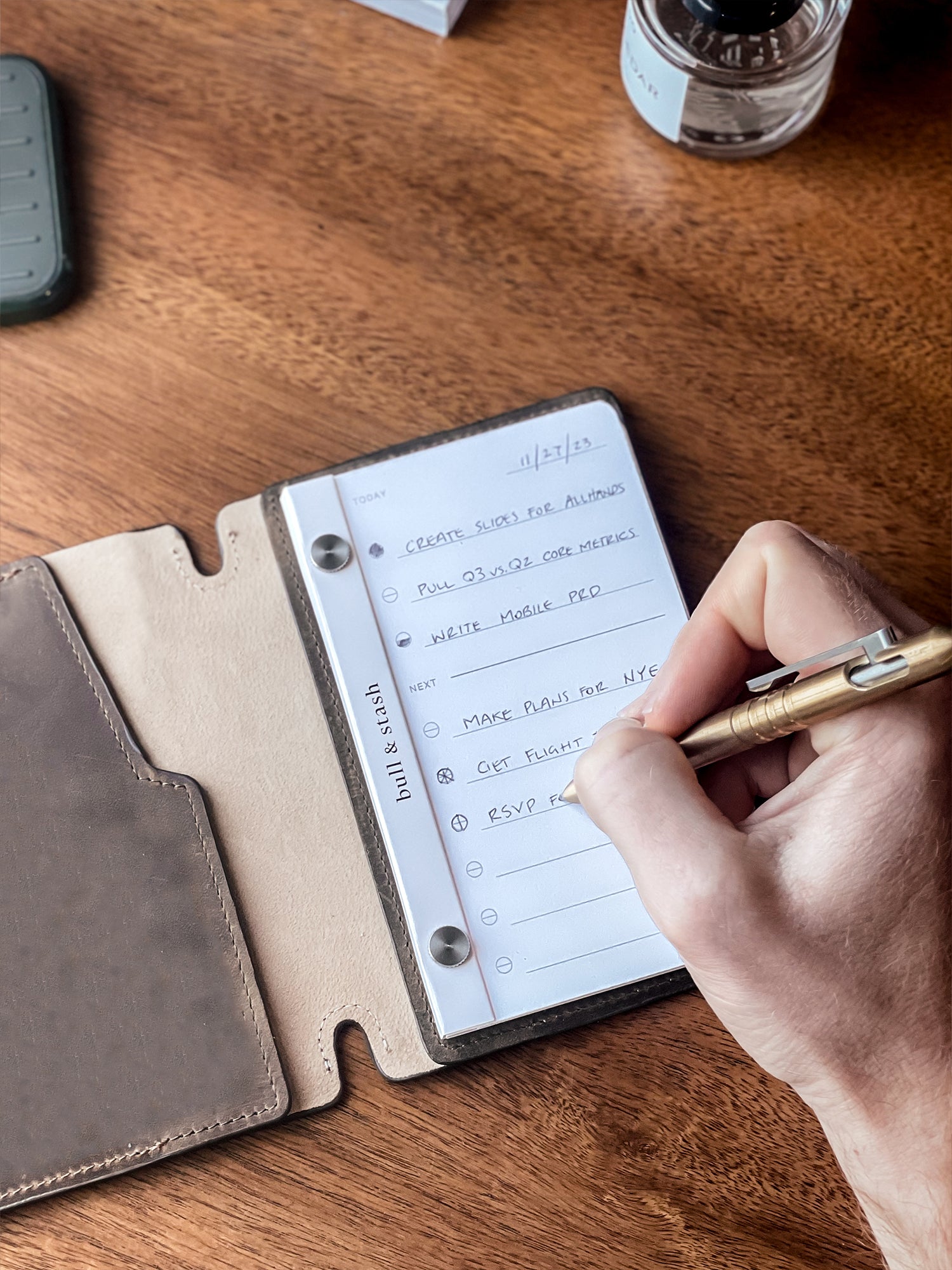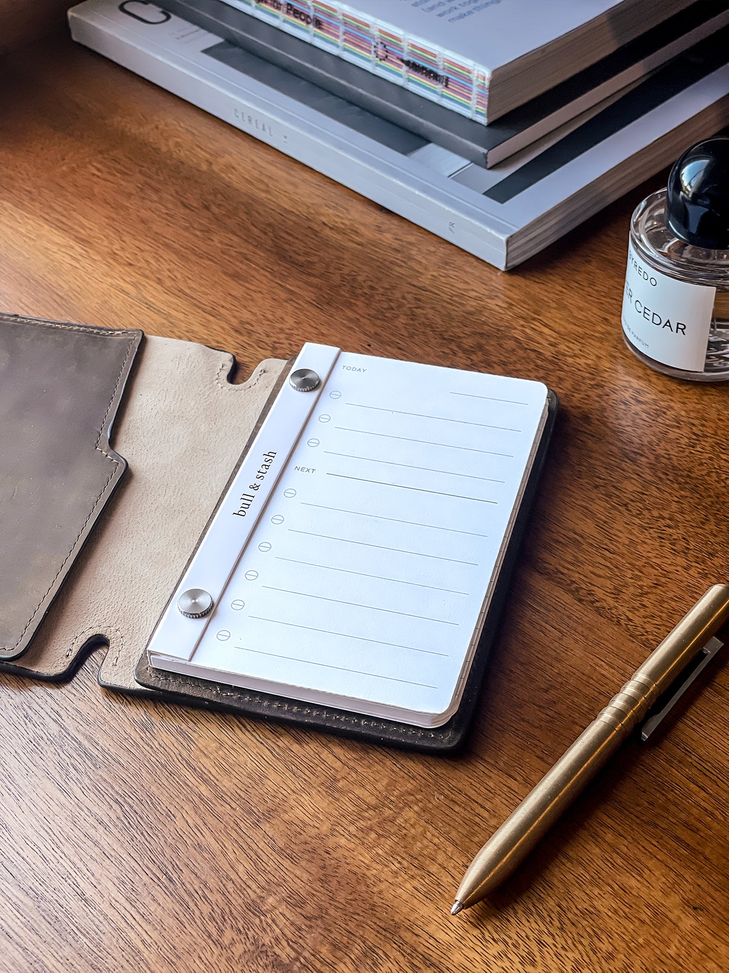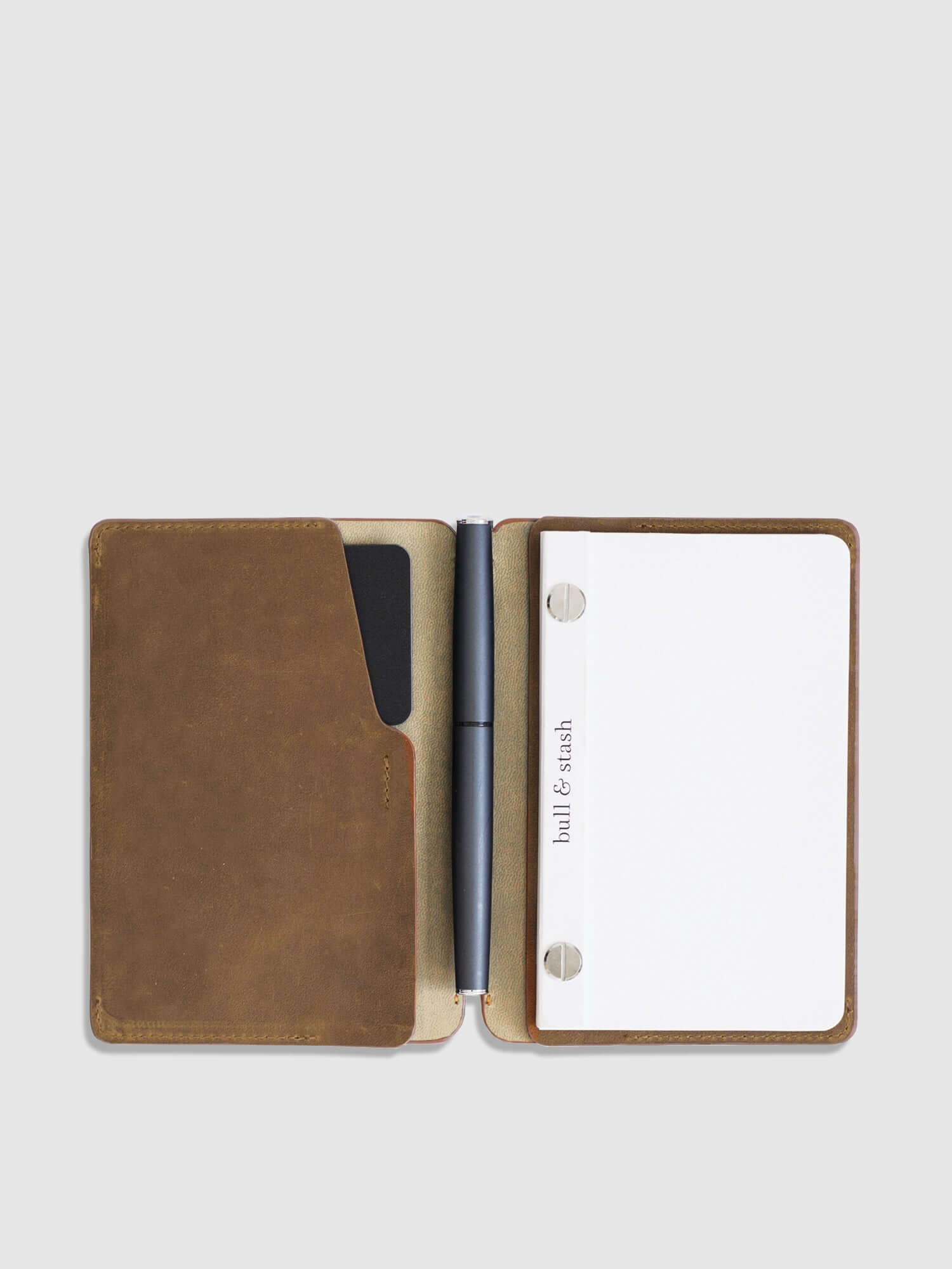 Our flagship Market Notebook was designed and built to last. This casual yet refined notebook includes two card slots, abundant interior pockets, and high-grade 316L stainless steel hardware. The loose-leaf refillable stationery inserts mean you’ll have this notebook forever. Distilled into a portable size, head into the office, out to meet a client, and into the weekend, all without missing a thought.